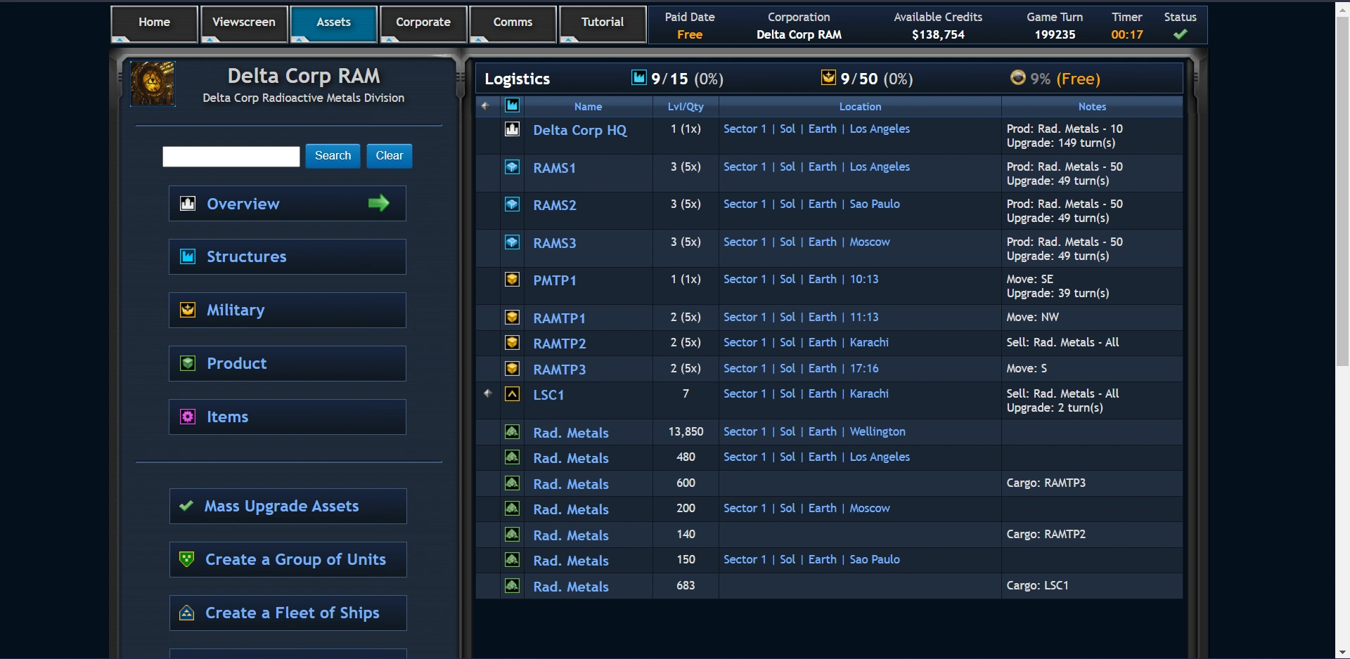 The Assets screen is where you can see and manage all of your structures, ships, ground units, products and items. On the left side are search controls, you can enter an assets name or filter the asset list by categories. Clicking on an assets name on the grid will take you to a details page where you can do different things depending on the type of asset.